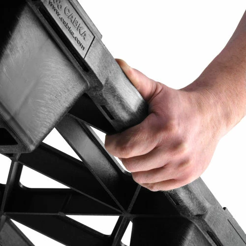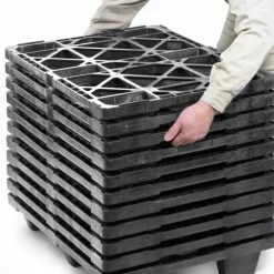 This nestable plastic pallet resists insects, bacteria and fungi. Plastic pallet is made of ACM recyclable black material. Lightweight, low height pallet is cost effective offering reduced freight costs by volume; 31 pallets nested are 6’H. Pallets nest when not in use for efficient storage. Sturdy construction gives this plastic pallet a static 5,500 lb. or a dynamic 2,200 lb. capacity, and allows 4-way forklift entry. 6 feet on the bottom support the weight. Measures 31-1/2″L x 23-2/3″W x 5-1/10″H. Conforms to ISPM 15 regulation.