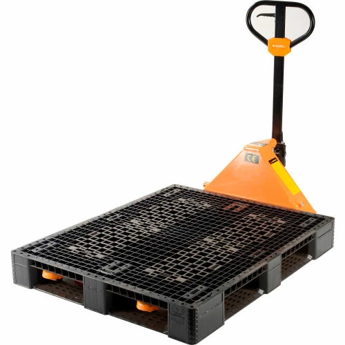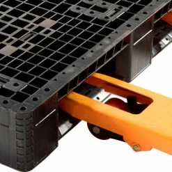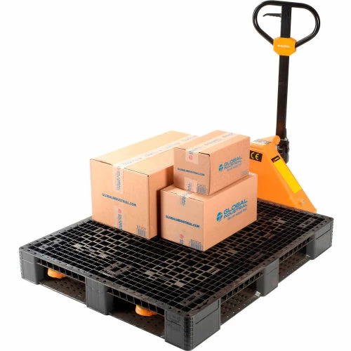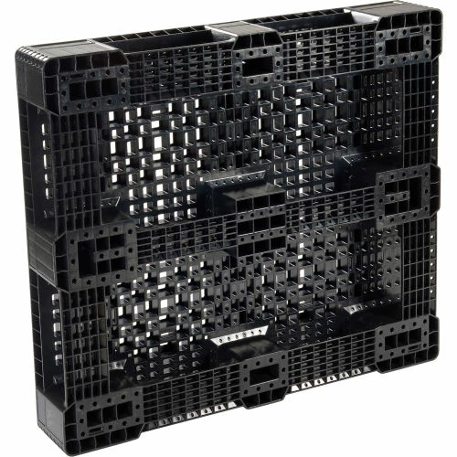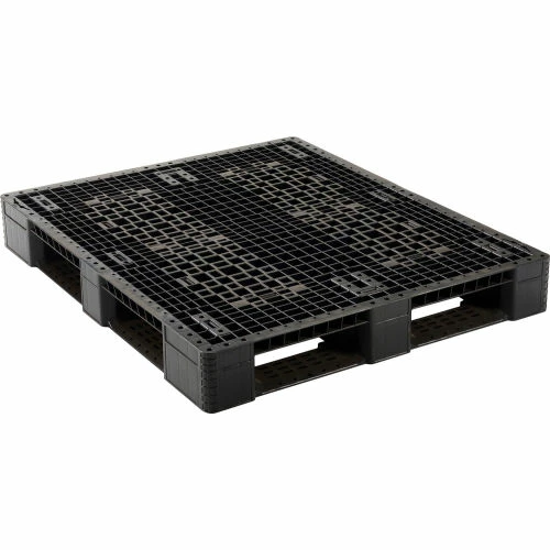 The double-sided black 48″ x 40″ Rackable Plastic Pallet from Global Industrial provides an environmentally-friendly alternative to conventional wood pallets or skids. One-piece, high-pressure injection-molded polypropylene plastic is ideal for food processing, meat, poultry, and pharmaceutical applications. This 100% recyclable pallet has a strong rib-reinforced design that minimizes dirt and dust collection, will not hold or trap water all while being easy-to-clean and washable. The pallets are stackable and allow 4-way fork access for forklifts and pallet trucks. FDA approved. ISPM 15-exempt for export shipping.