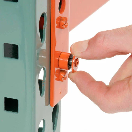 High strength 15-gauge beams. 2-3/4″W x 1-1/2″ step beams accommodate cross bars and decking. Interlock stud and keyhole connection automatically locks into column. Piston lock secures beam into place.