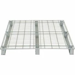 Galvanized Welded Wire Pallets will stand up to heavy-duty use. Design allows for stacking. Four-way access with pallet truck and for trucks. Open decking features 24″ x 4″ grid pattern. Usable height on open end is 3″. Usable height on stringer end is 2-3/4″. Understructure supports are made from 12 gauge steel. Decking is made from welded wire steel. Welded steel construction with galvanized finish.